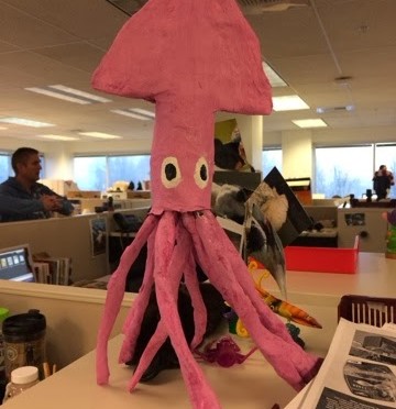 Here’s the first papier mâché squid. A second one is in the works, but I’m having some trouble deciding on the color. I’ve even been tempted to add glitter. As much as I love glitter, I’m not sure that’s the right approach. Oh well, there’s no need to decide tonight.