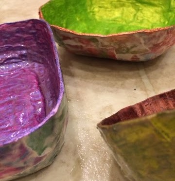 Now comes the part where I get to play with paint and see how it looks on the papier mâché bowls and whatnot. I can’t lie, I love the look of the marbled paper. That was just distress paint and regular old copy paper. It looks better than I thought it would.