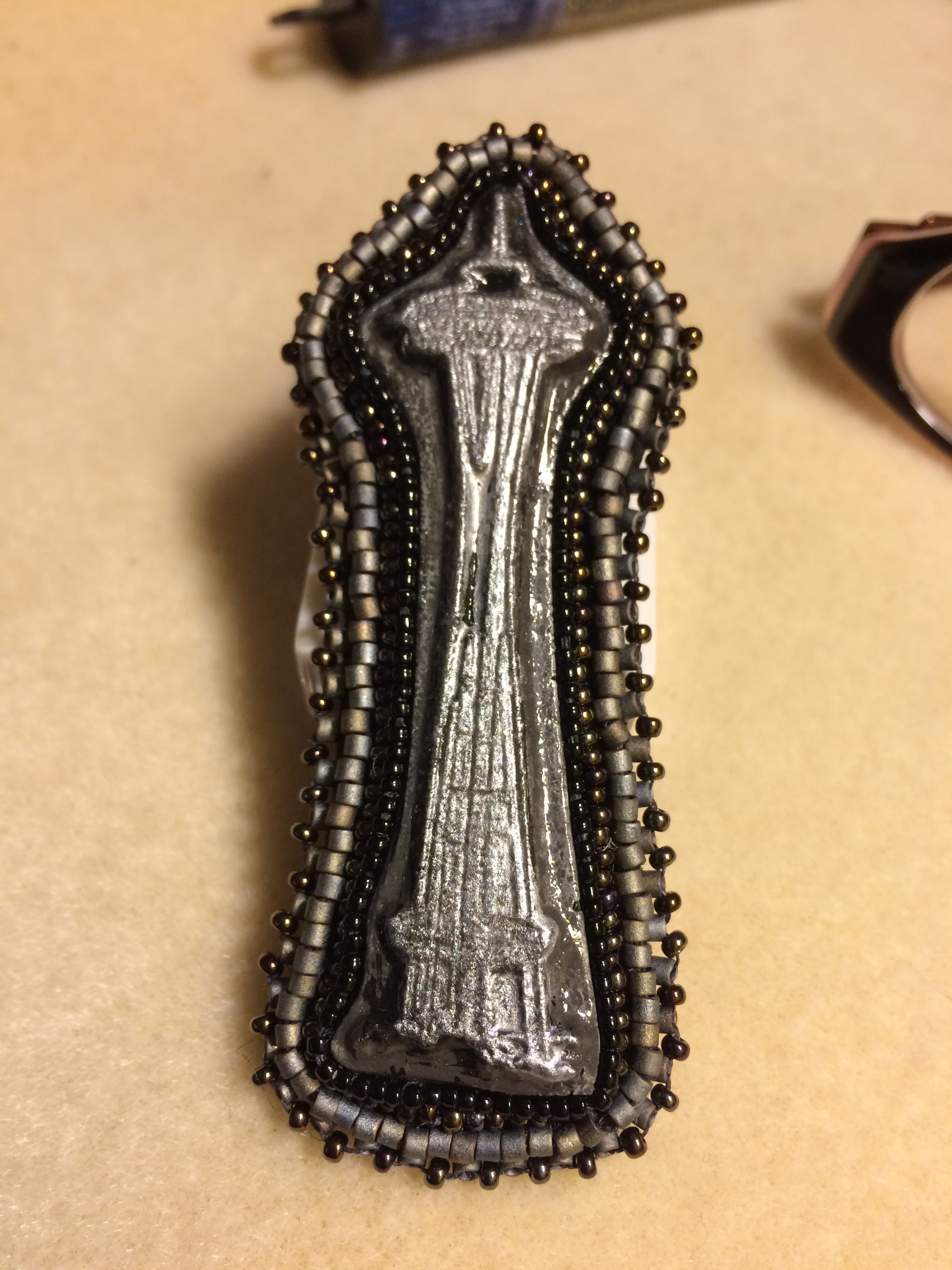 Then there’s this space needle. It will be, as Morgan called it, a “pindant.” I need one of those pin/brooch converters first. And, how did he know about those and I didn’t?