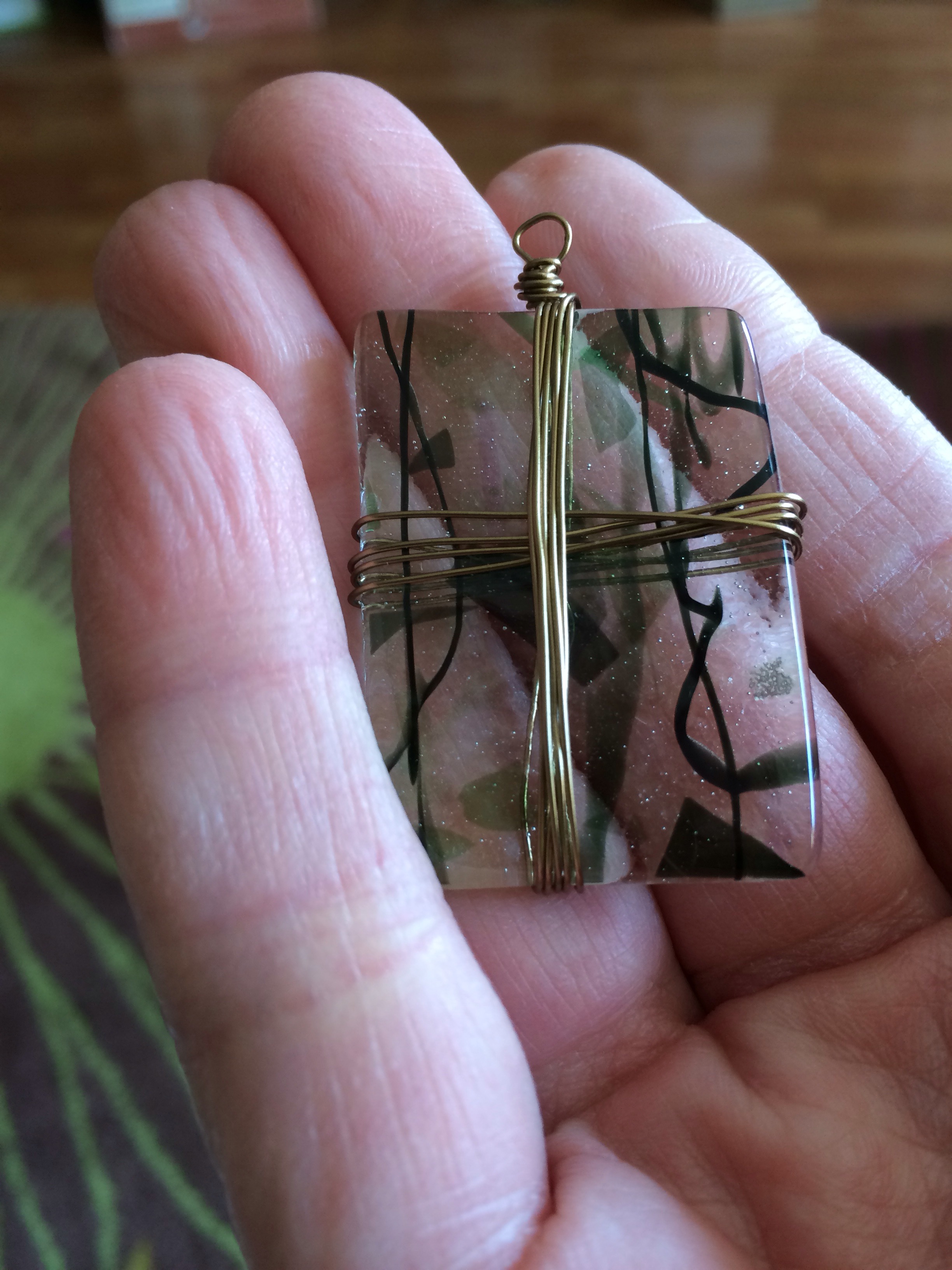 Today’s challenge was to play with wire. I don’t have the time to do everything I want, but I kind of like this wire-wrapped piece of glass that I fused last weekend.