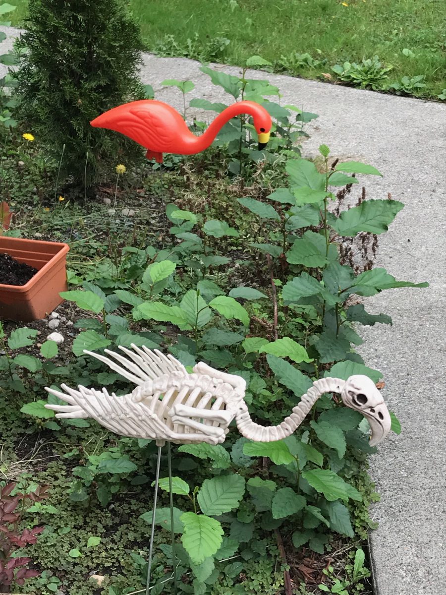 Now that we have a yard, it’s fun to have yard decorations. We have three pieces of beautiful glass art and 25 flamingoes in various colors and life stages.