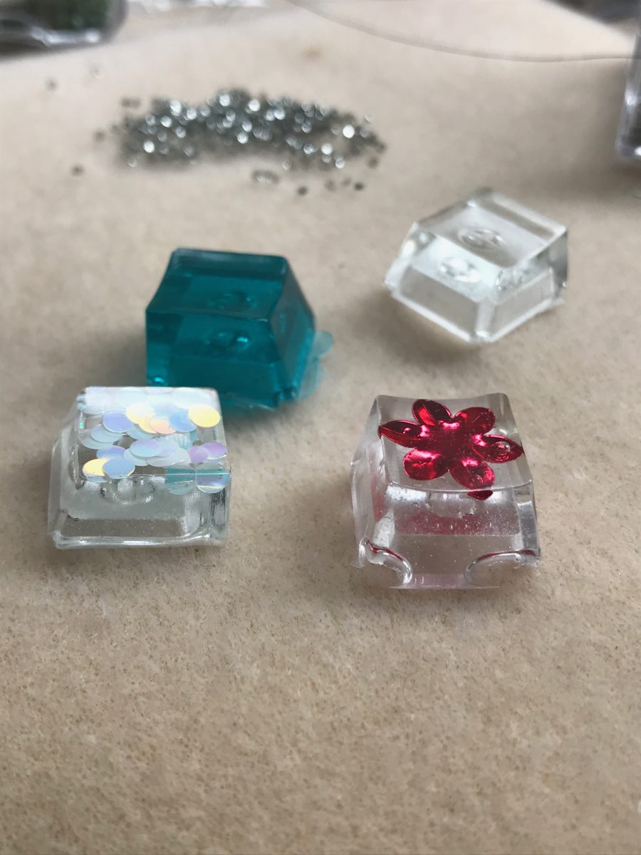 Even if I smoosh in the bottom piece to make the keycap Cherry MX switch compatible, I can’t get it to sit down far enough so that the keycap will fit on a switch. I’m left with resin that oozes out and a keycap that doesn’t work on the switch. I’ll give it a few more tries, but until then, marbling and other tiny embellishments for pre-made keycaps are my friends. Hey, what about a very tiny mosaic on top of a keycap? It’s worth a try.